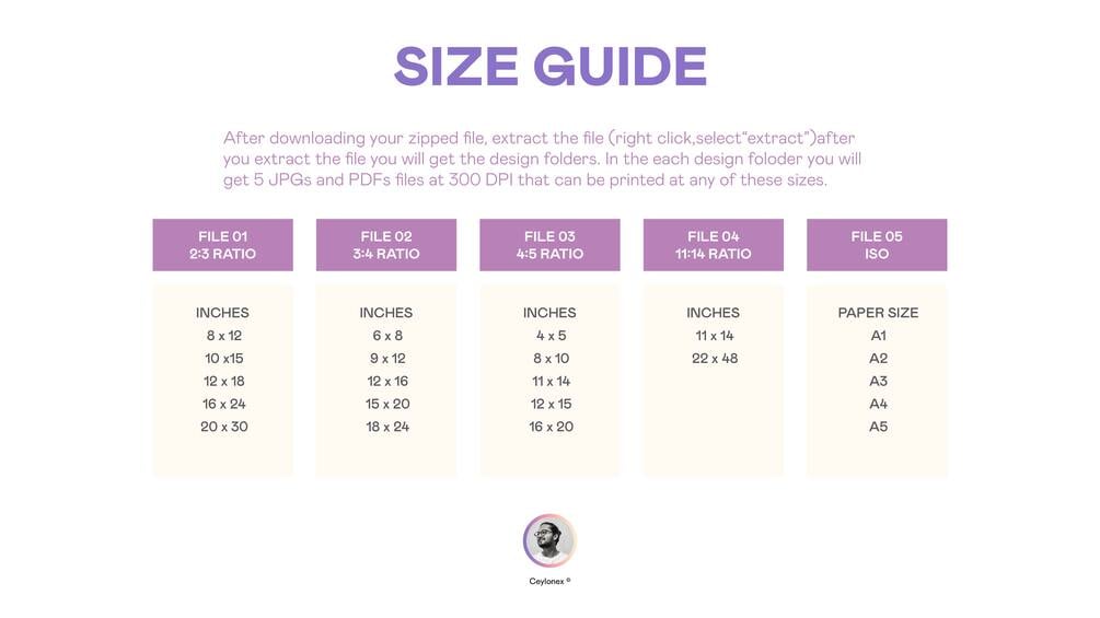 You'll get 5 files of JPG and PDFs printable wall art with different ratios for each design.